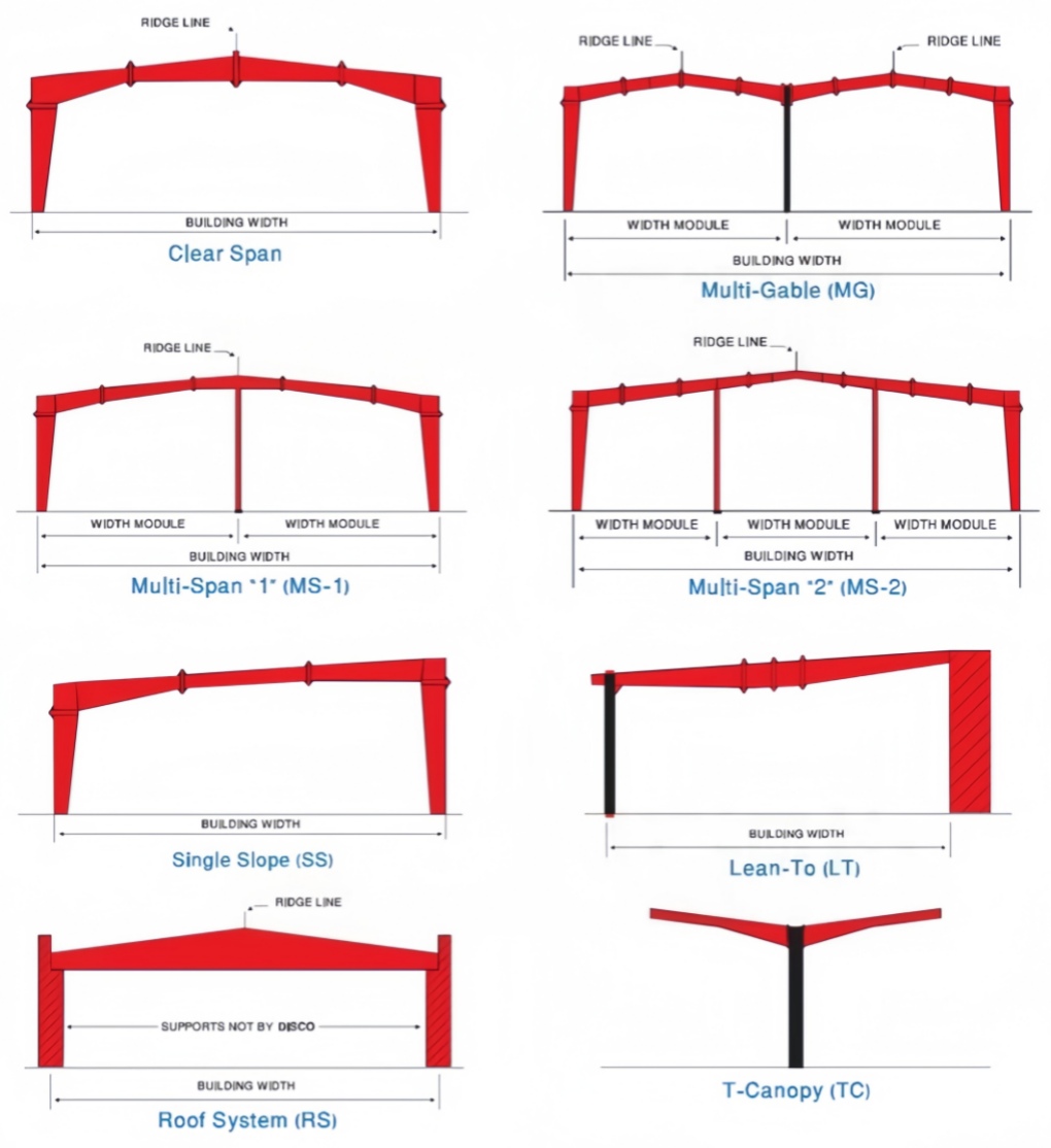 Primary Frames are the main load-carrying structural steel components. They may be Clear-span Rigid Frames, Continuous Beam Frames, or Post & Beam Frames. Primary frames are designed in accordance with the steel construction manual published by American Institute of Steel Construction (AISC). Manufacturing dimensional tolerances are in accordance with the requirements of ‘Metal Building Manufactures Association’ (MBMA) of USA, “Low Rise Building Systems Manual”. Besides AISC and MBMA, we also design buildings with IS-875, 1984 and IS-875, 2007. Built-up sections are fabricated from hot rolled steel plates confirming to ASTM A 572M grade or equivalent with minimum yield strength of 345N/mm2 (50ksi). The most common primary framing systems are illustrated here. All structures shown are symmetrical about the ridge line. Framing systems unsymmetrical about the ridge line and Multi span Framing Systems with unequal width modules are possible too. Practically any frame geometry can be erected.