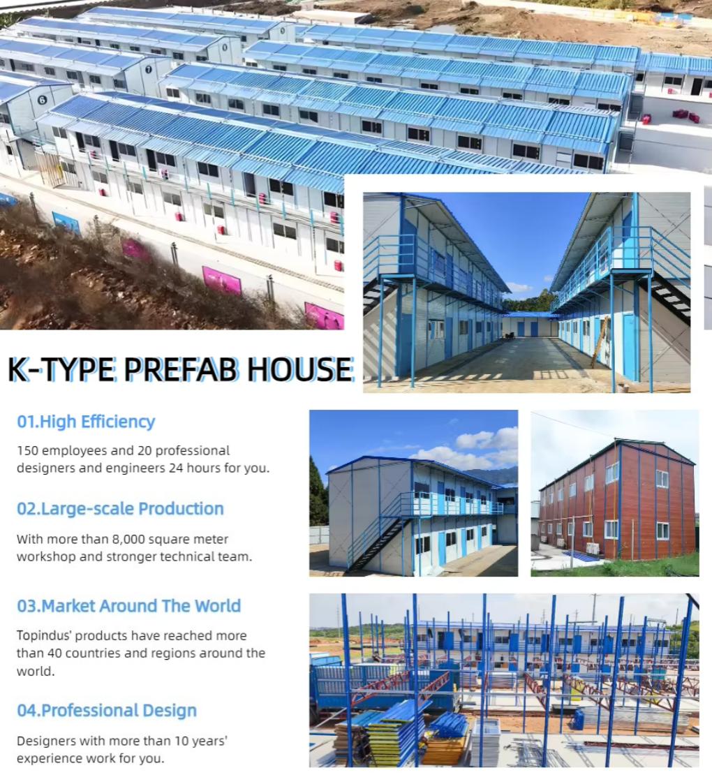 This Temporary Construction Site Prefabricated K House is a lightweight, modular construction product with simple structure, diverse functions, and convenient installation. It uses a light steel structure as the framework and is equipped with high-performance core-ply color steel plates as the wall materials, ensuring the overall building's stability and durability, as well as excellent insulation, waterproofing and soundproofing properties. It is widely used in construction sites, temporary dormitories, office spaces, warehouses, barracks and other short-term and long-term scenarios. Compared with traditional temporary buildings, the K-type Construction Site K House has significant advantages in structural performance, construction efficiency and environmental friendliness.