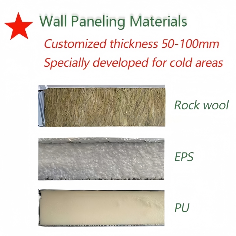 | Wall | 50mm/75mm/100mm Rock Wool, EPS,PU sandwich panels |