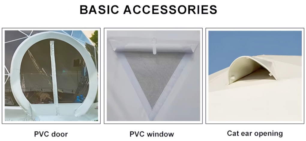 The pvc winter glamping dome tent is equipped with practical basic accessories, including: