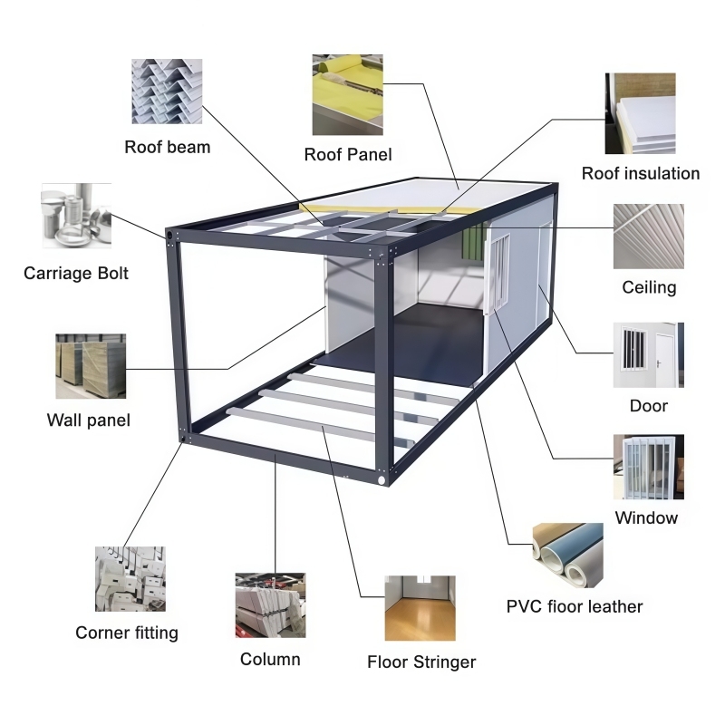 A7:Wall panels are made of 50mm rock wool sandwich panels, and can be upgraded to 75mm and 100mm thickness, which is better for extreme cold and hot weather
